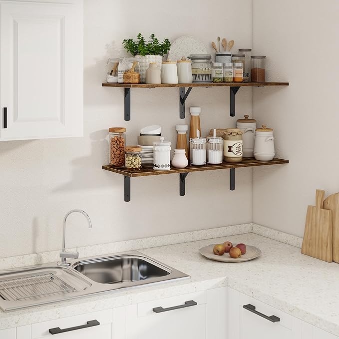 - 【FARMHOUSE RUSTIC FLOATING SHELF】These floating shelves are made of premium engineered wood board and visible triangular bracket. The rustic wooden grain surface add character and warmth to any modern or traditional interior with these deep floating shelves, contrast shelves at staggering heights on the wall or mount side-by-side or in the corner for a clean streamlined look.