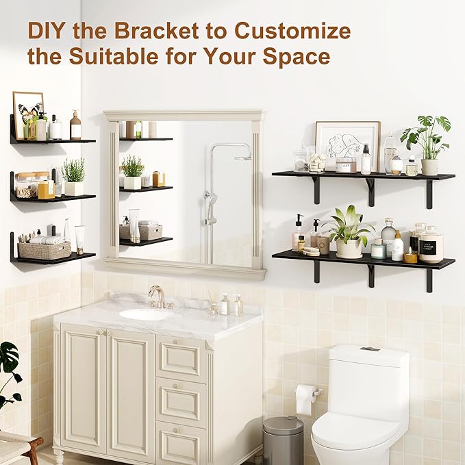 - 【DECORATIVE & FUNCTIONAL】The wall-mounted floating shelves are designed for decoration and storage, utilizing and decorating any space in your home. Used as shelf decor to show your collection, books, or prize, the hanging shelves are perfect for displaying your photo frame, small plants, model, or audio in your living room, office, study. And can also use as over the toilet storage shelf in the bathroom to hold toiletries or used as kitchen shelf to storage condiments.