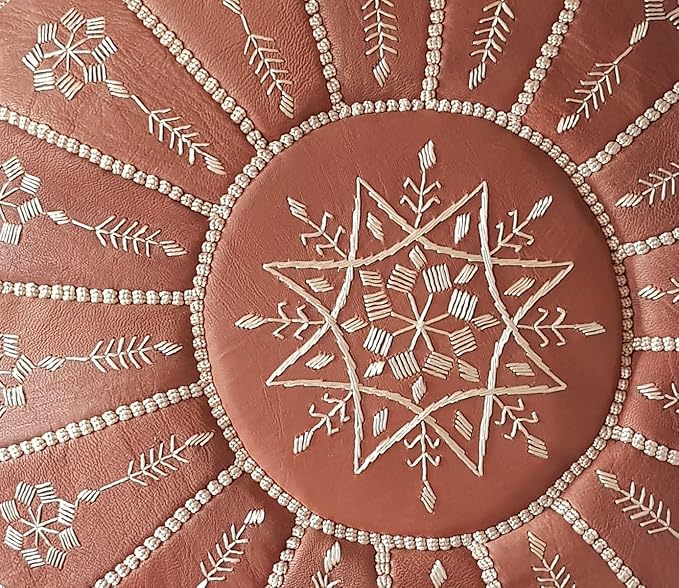 - Authentic Moroccan Leather Pouf – Handmade in Marrakesh – Crafted by skilled artisans using 100% genuine soft goat leather, this round pouf features intricate hand-stitched embroidery and traditional detailing, making each piece truly unique.