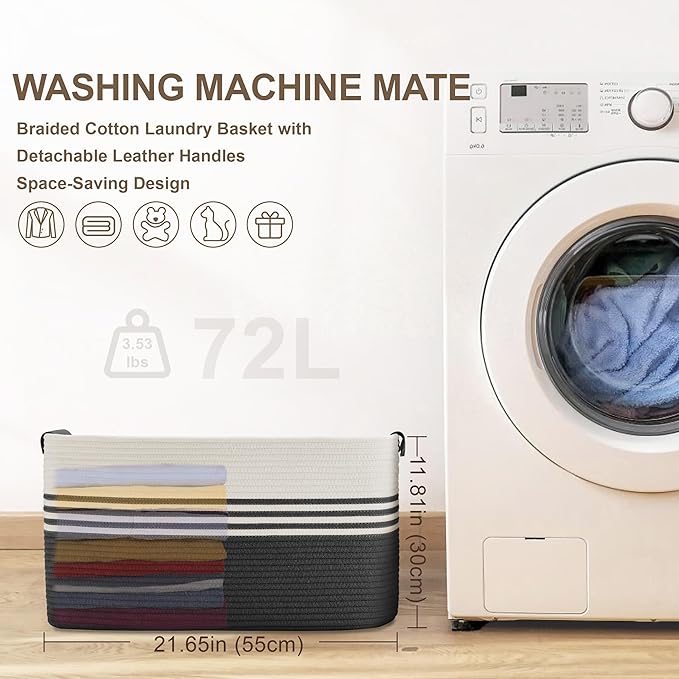 72L Large Laundry Basket with Leather Handles for Living Room Storage, Woven Rope Baskets Bin for Blanket, Kids Toy, Gifts, Wicker Hamper for Bedroom Dirty Clothes, 22"x17"x12" White Black