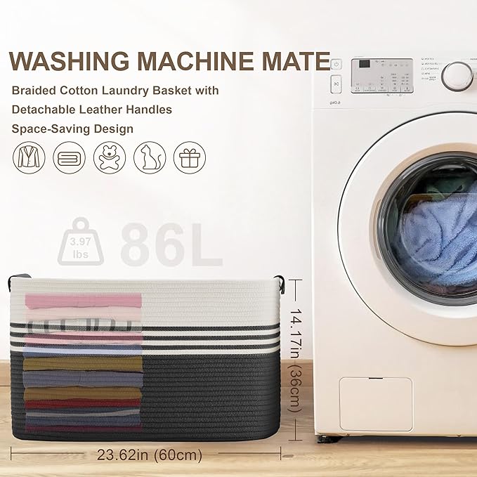 86L Extra Large Laundry Basket with Leather Handles for Living Room Storage, Woven Rope Baskets for Blanket, Kids Toy, Gifts, Wicker Hamper for Bedroom Dirty Clothes, 24"x16"x14" White Black