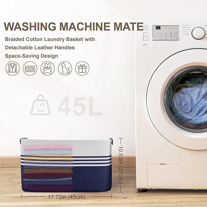 - STYLE MEETS VERSATILITY:Navy storage basket. Laundry basket with vintage colors and patchwork stripe elements, which can perfectly integrate both bohemian and modern styles, is not only suitable for home, but also suitable for single apartments, student dormitories, offices and other scenes
