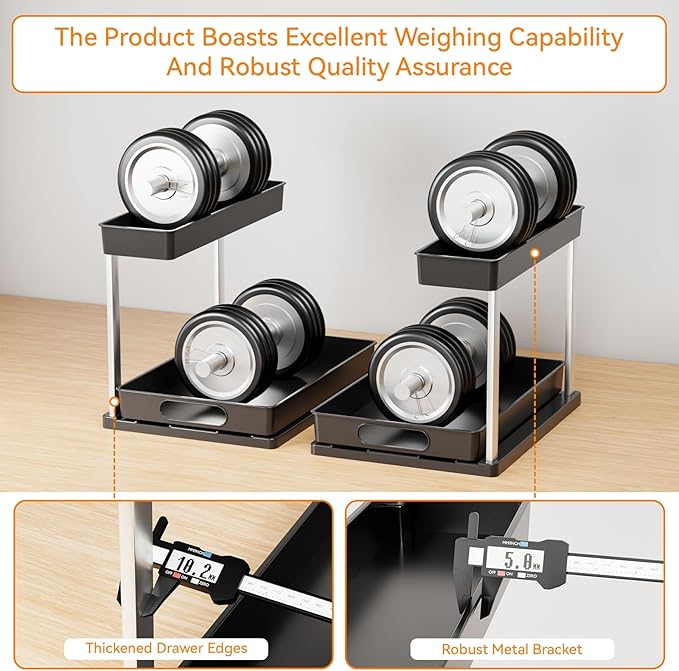 - 【Assembled Dimensions】under kitchen cabinet storage size 10″ L*14.5″ D*10.8″ H x 2 Pack. Top basket: 14.5*4.5*1.7 in, bottom basket: 14.5*9.1*1.6 in. The bottom area can hold bottles up to 8 inches in height.(Please make sure to measure the cabinet size before purchasing)