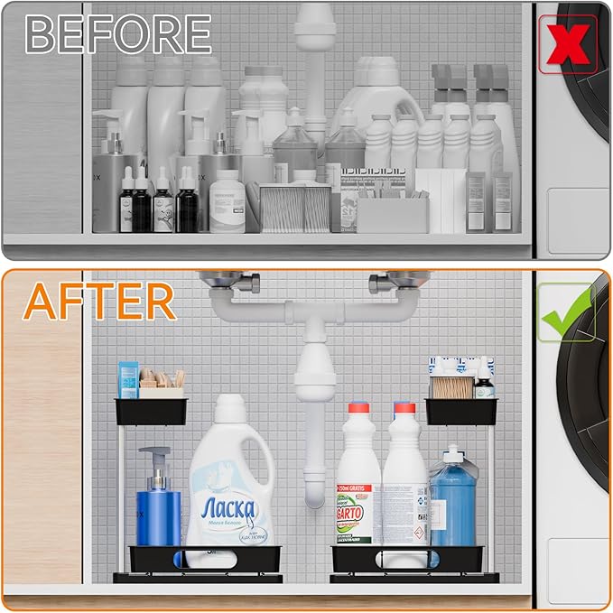 - 【Multi-purpose Organizer】Ideal for sinks,rv,small space,apartment,Countertop, under the counter,kitchens and bathrooms. It can be used as bathroom Cleaning products, makeup skincare products, hair products,toiletries storage, kitchen spice rack or laundry room storage, etc. to keep your items organized and in order