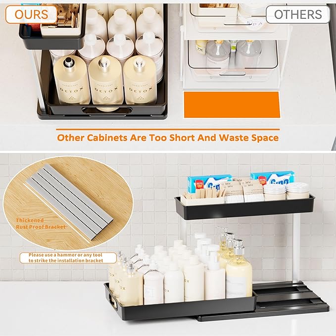 - 【Easy Installation】our sink cabinet organizer Equipped with anti slip silicone foot pads, insert the metal bracket into the organizer and stick the anti slip pad,It only takes 1 minute to complete(To ensure stable use,The slot design is compact,It is recommended to use a hammer or any other tool to strike and install it)